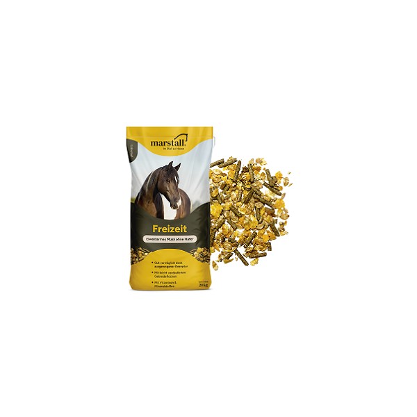 marstall Freizeit: Haferfreies Komplettmüsli für stehende, leicht und wenig beanspruchte Pferde aller Rassen. Eiweißarm und mit reduziertem Energiegehalt für ausgeglichene und zufriedene Pferde. Mit aktivierenden Meeresalgenextrakten und Bierhefe, Apfeltrester sowie vollwertiger Mineralisierung und Vitaminisierung.