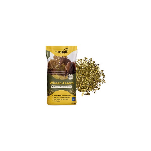 Wiesen-Fasern sind ohne jegliche Zusätze, also frei von Melasse, Öl oder Zusatzstoffen. Mit einer Häcksellänge von1-2 cm, stellen Wiesen-Fasern für das Pferd wertvolle Rohfaser mit bester Struktur-Wirkung dar. Eingemischt, als tägliche „2-3 Handvoll“ Struktur unter das Kraftfutter, werden Kautätigkeit und Speichelbildung intensiviert sowie der Dickdarmflora die nötige Rohfasergrundlage zugeführt.