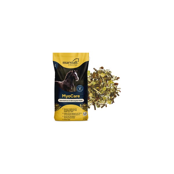 MyoCare-Müsli wurde für die spezielle Ernährung von Pferden mit PSSM 1, PSSM 2 und RER entwickelt. Dabei wurden die derzeitigen wissenschaftlichen Erkenntnisse und Empfehlungen berücksichtigt. Deshalb enthält das Müsli wenig Stärke und Zucker, besitzt aber einen hohen Gehalt an dünndarmverdaulichem Protein sowie reichlich Vitamin E plus Mangan, Selen und Öl. Damit leistet marstall MyoCare-Müsli einen wichtigen Beitrag zum Wohlbefinden von Pferden mit erblich bedingten Muskelproblemen.