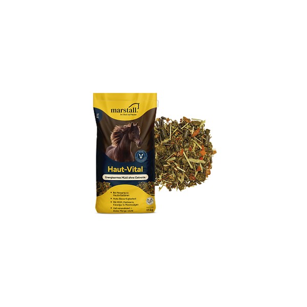 Marstall Haut-Vital ist ein getreidefreies Müsli, das speziell für Pferde mit sensibler Haut entwickelt wurde. Dies gilt unabhängig davon, ob bereits Hautprobleme sichtbar sind oder nicht. Das Besondere an dieser energiearmen Rezeptur ist die hohe Konzentration an pflegenden Nährstoffen, die gleichzeitig optimal für das Pferd verfügbar sind. Die sorgfältig ausgewählten Zutaten tragen dazu bei, die natürliche Funktion und Regeneration der Haut zu stärken.